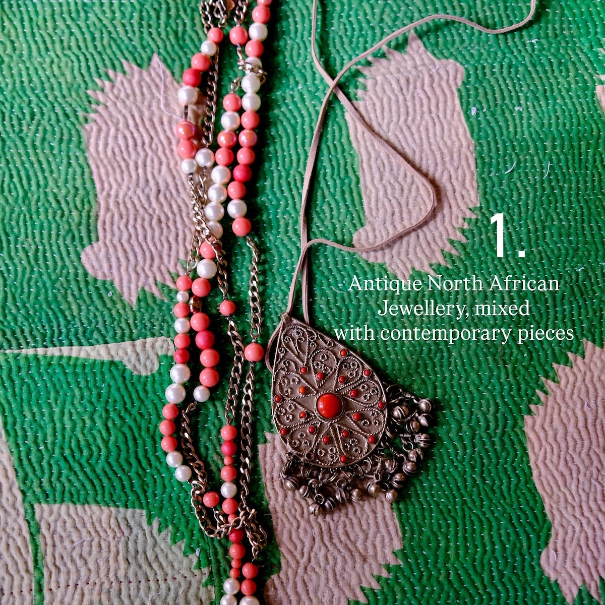 Antique North African jewellery paired with contemporary pieces creates a dialogue between past and present. We love how coral beads and silver filigree add a story to every look.