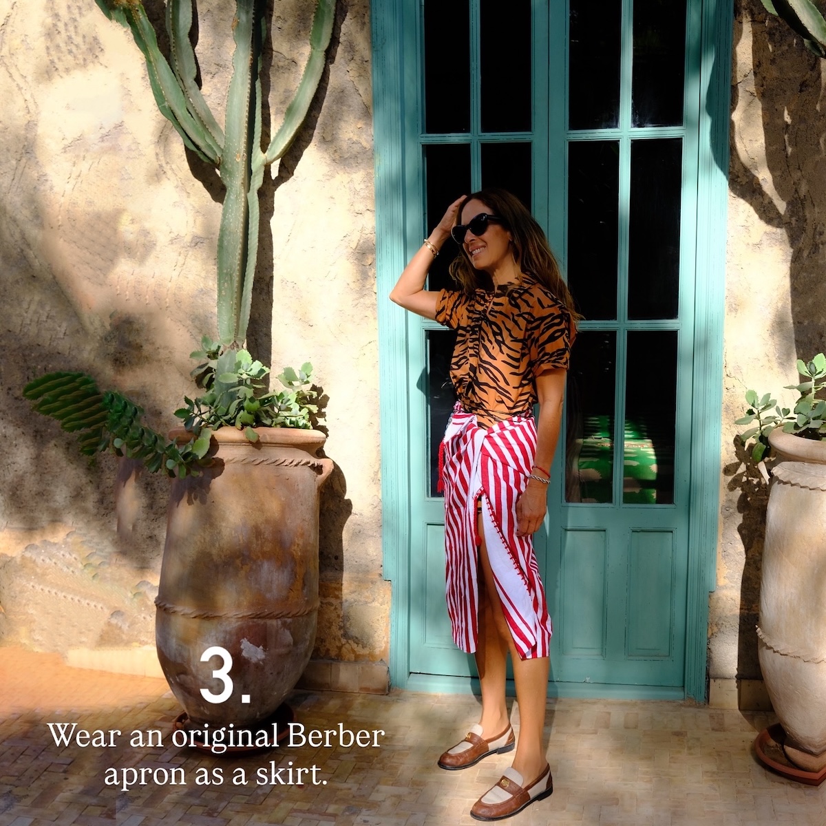 A traditional Berber apron becomes a statement skirt. Wrapped and tied simply, it brings artisanal flair to everyday dressing.