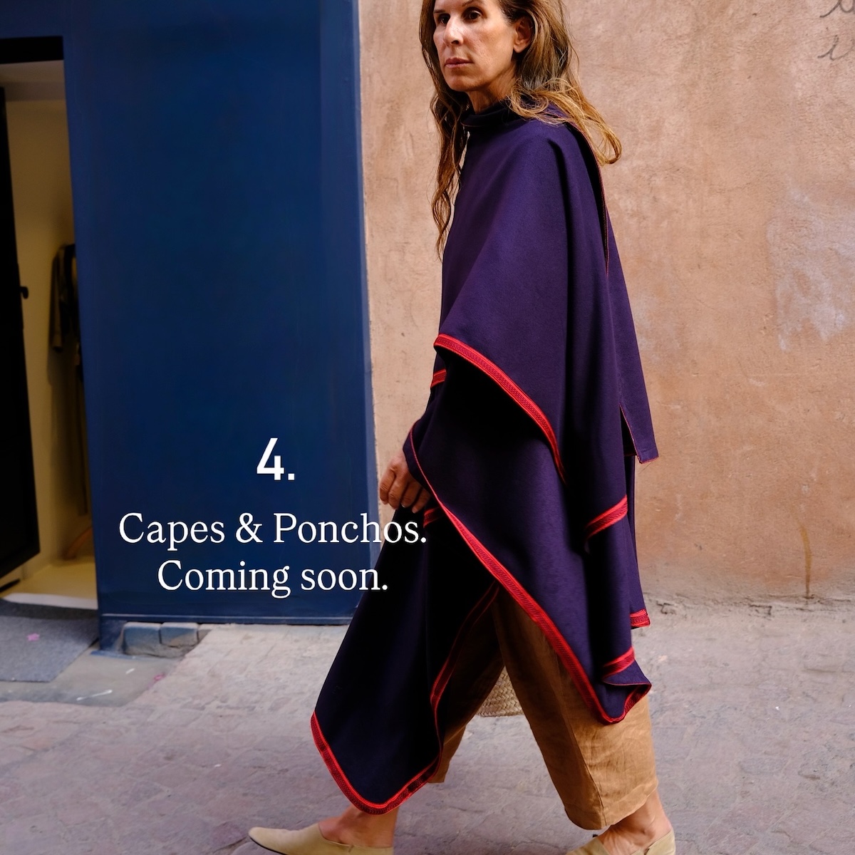 Capes and ponchos are our new season’s essentials. Their flowing silhouettes move beautifully with every step.