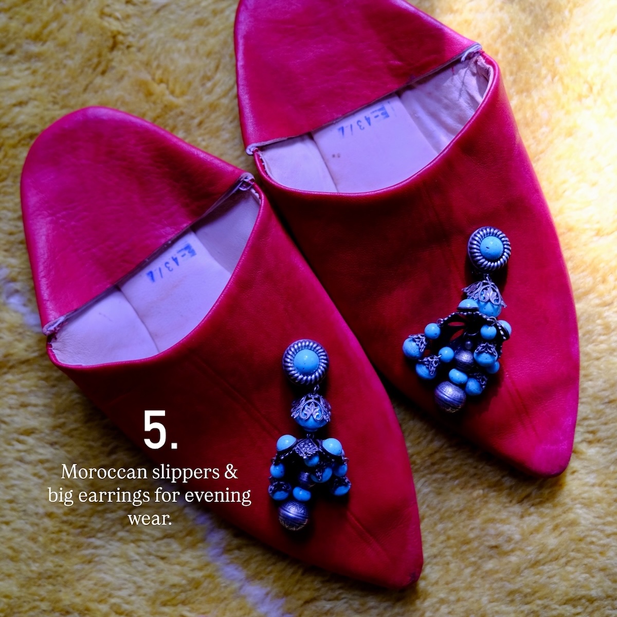 Bright slippers and large earrings turn evening wear into an effortless statement. We love the contrast of comfort and glamour.