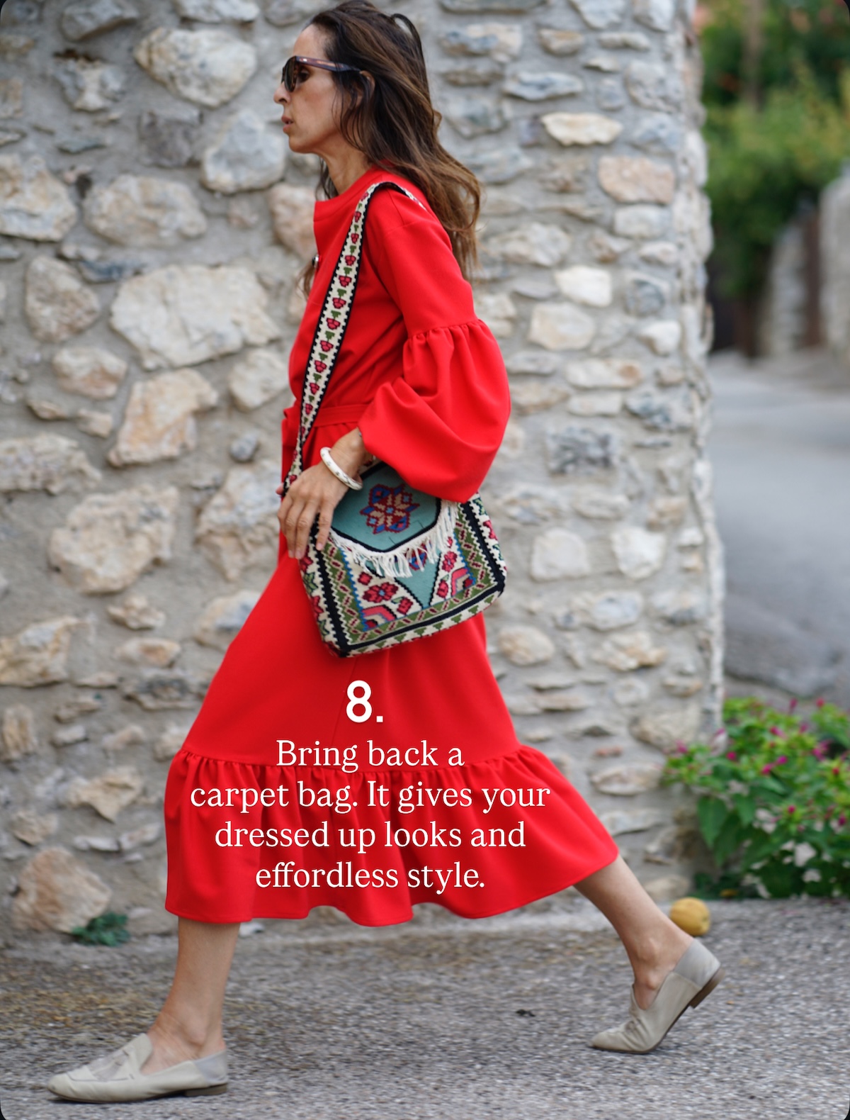 Bring back the carpet bag. It adds an effortless, bohemian touch to tailored looks and flowing dresses alike.