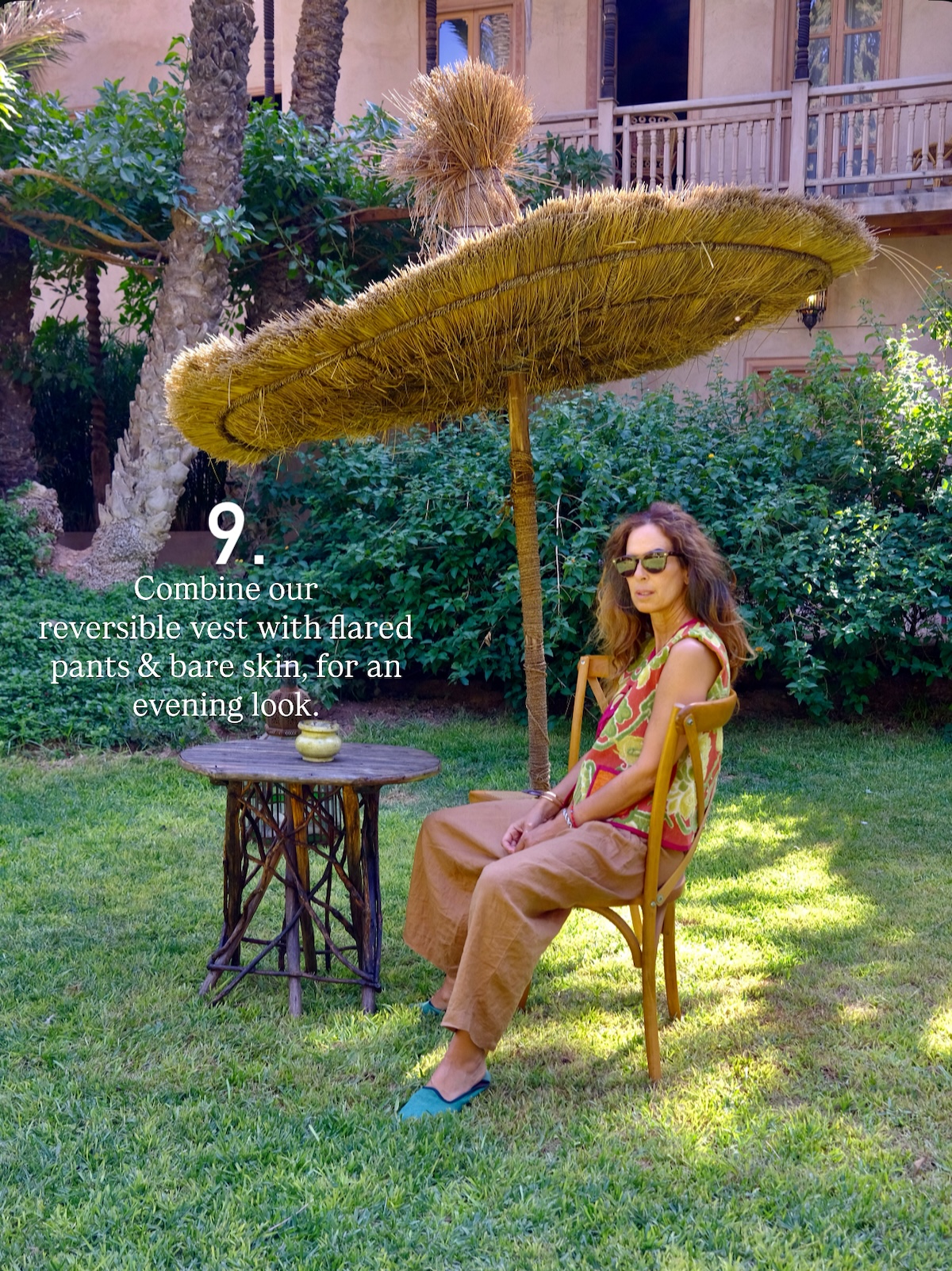 Our reversible vest worn with flared trousers and bare skin becomes an elegant evening option. Relaxed, sensual, and free.