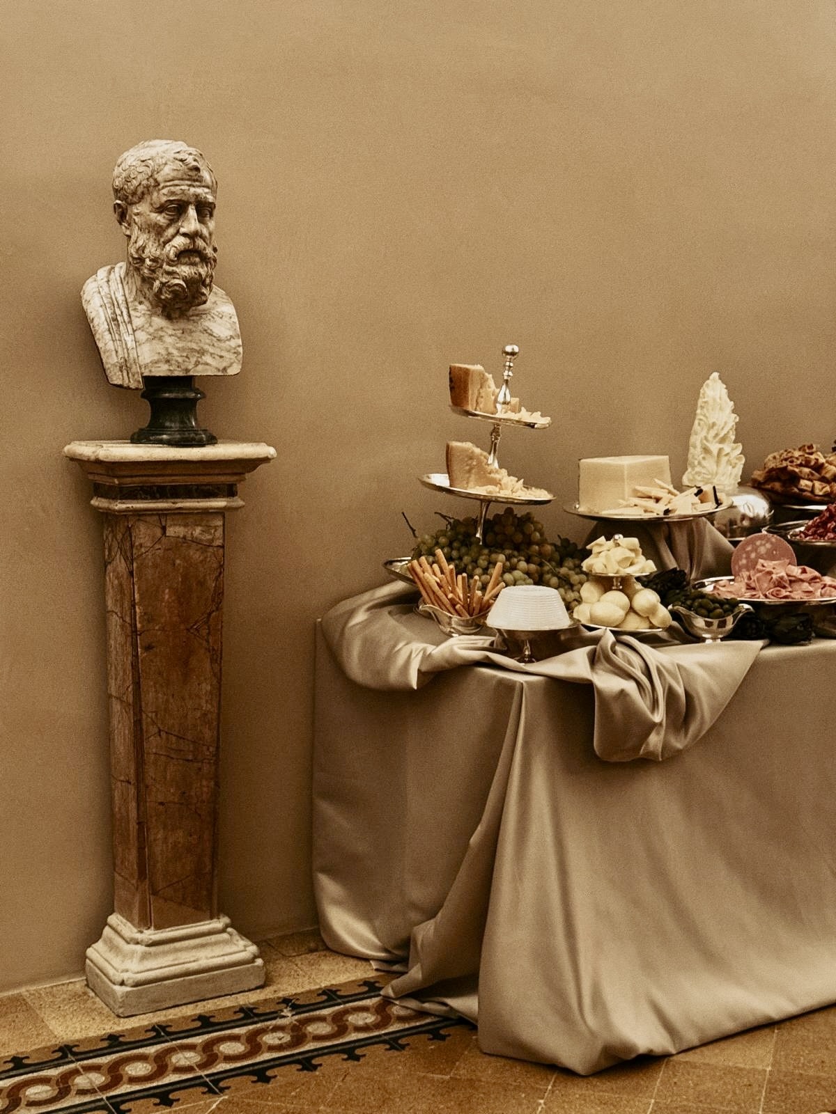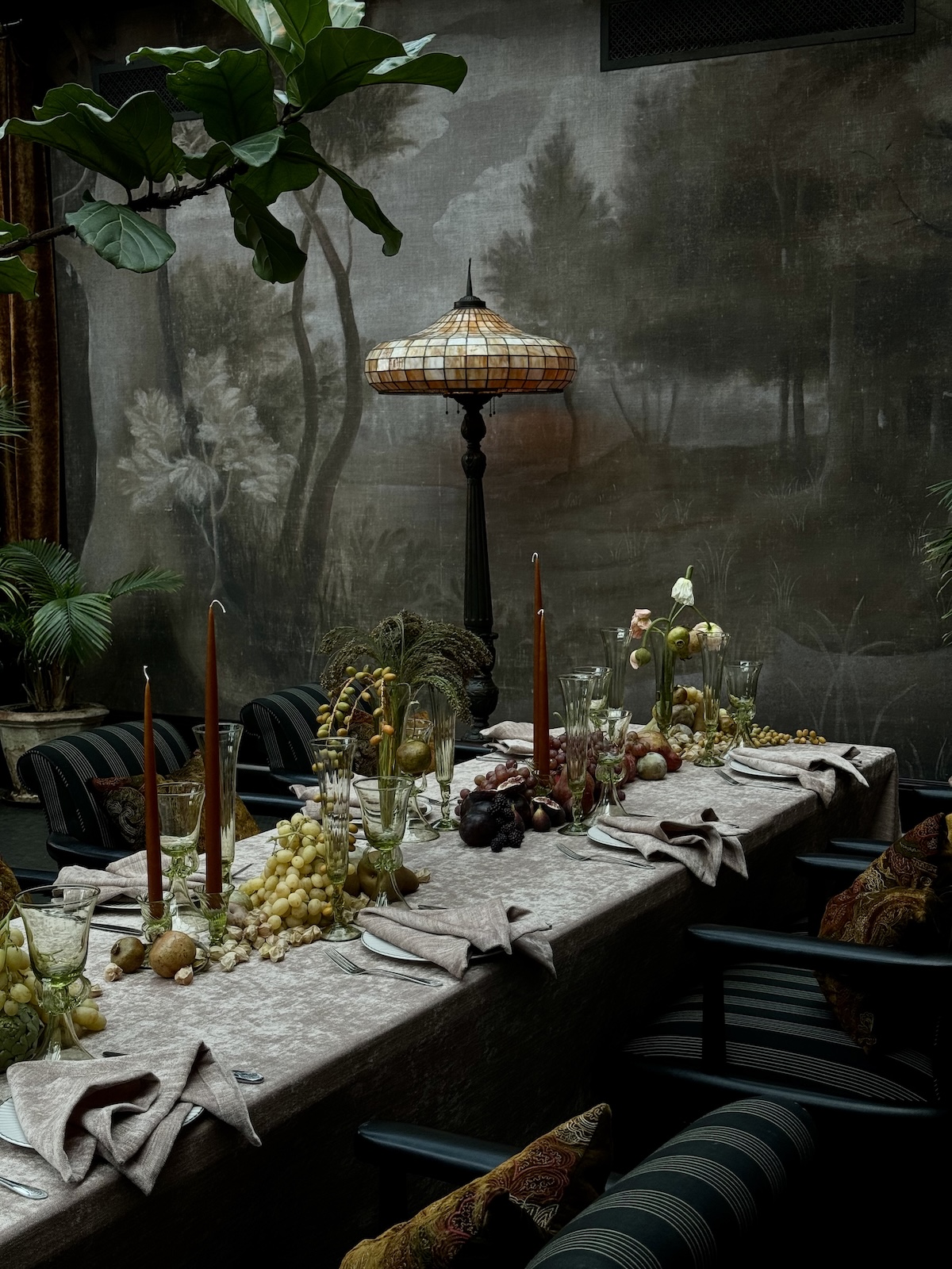 Lighting, she says, is just as important as the materials. “When I set a table during the day, I always ensure there’s natural daylight, but never direct sunlight. If I’m indoors, the light should come from the side — like in a still-life painting.” For evening gatherings, candlelight, amber tones, and subtle spotlights create what she calls the perfect balance between clarity and atmosphere. “I want guests to feel comfortable, cozy, sexy — I want them to stay longer. Light creates emotion, and emotion is everything.”