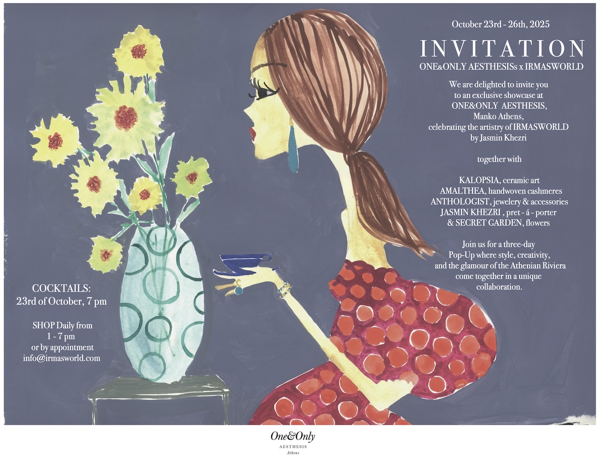 If you have not yet planned your autumn break, join us next weekend on the Athenian Riviera for a very special IRMASWORLD Pop-Up. From 23rd to 26th October 2025, ONE&ONLY Aesthesis in Manko Athens will host an exclusive three-day showcase celebrating the artistry and world of IRMASWORLD by Jasmin Khezri.