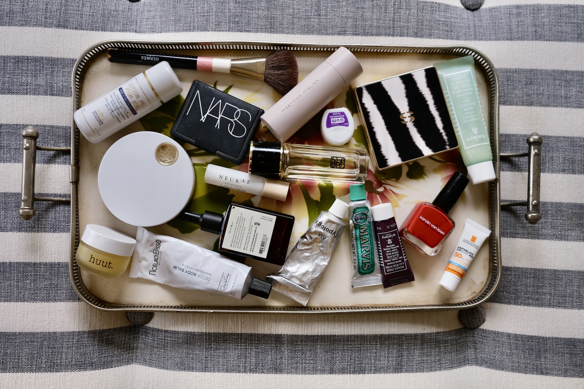 Then comes protection: La Roche-Posay Anthelios UVMune 400 is worn daily everywhere. It is lightweight, invisible and essential for use during and after flights.